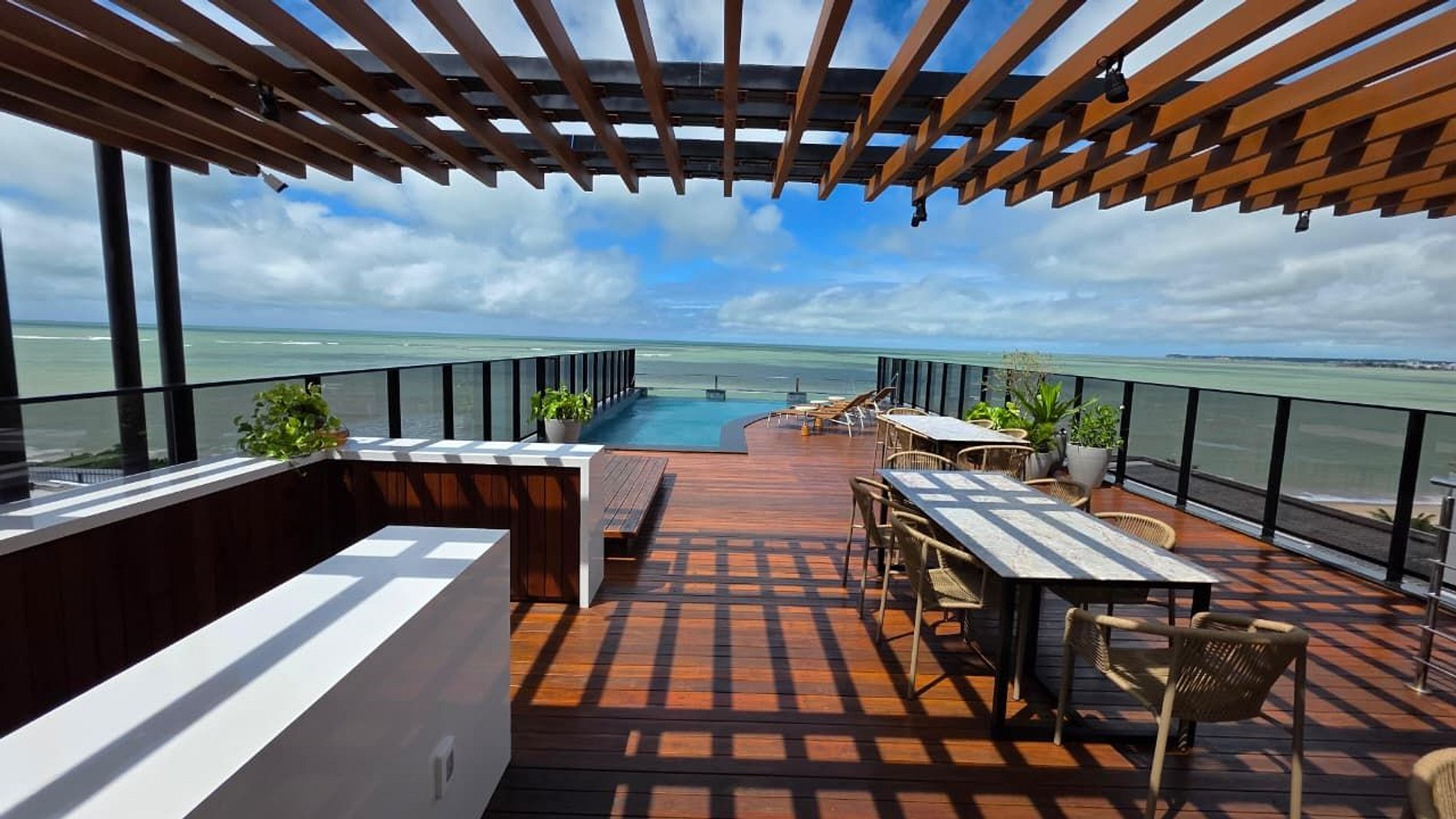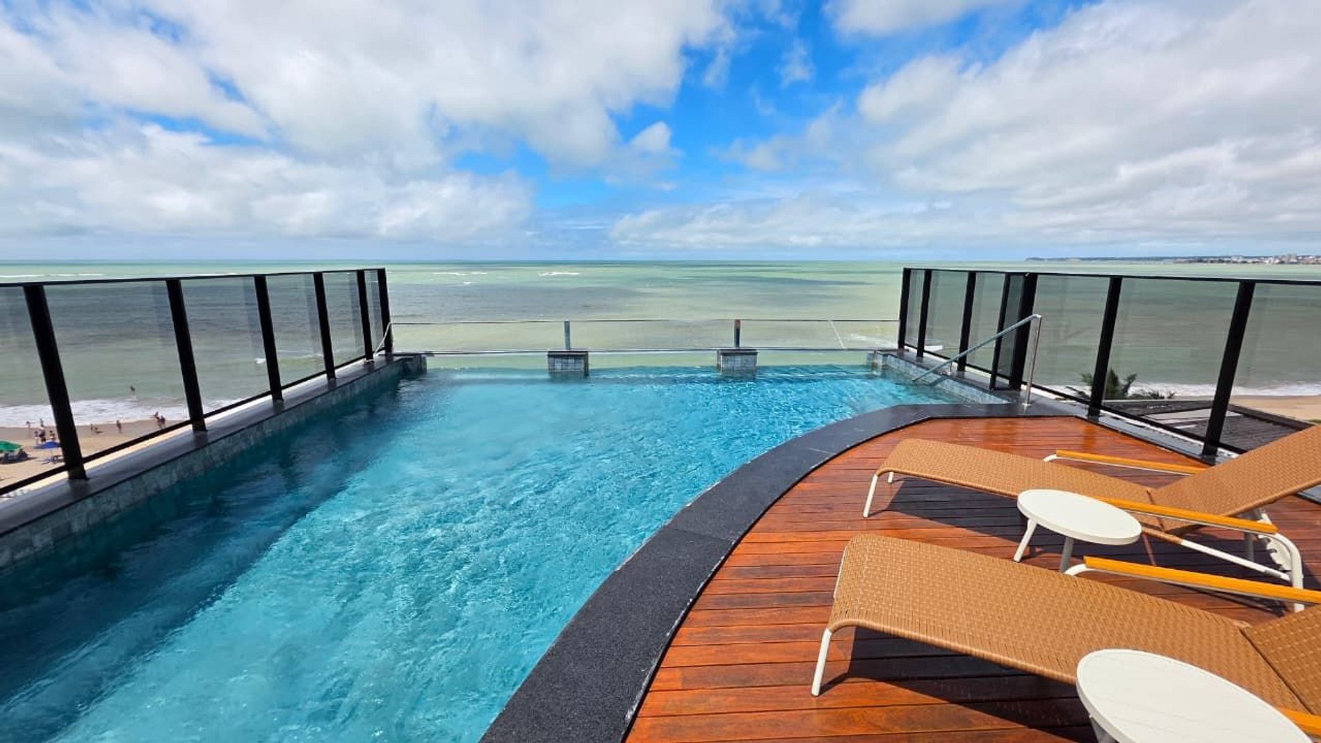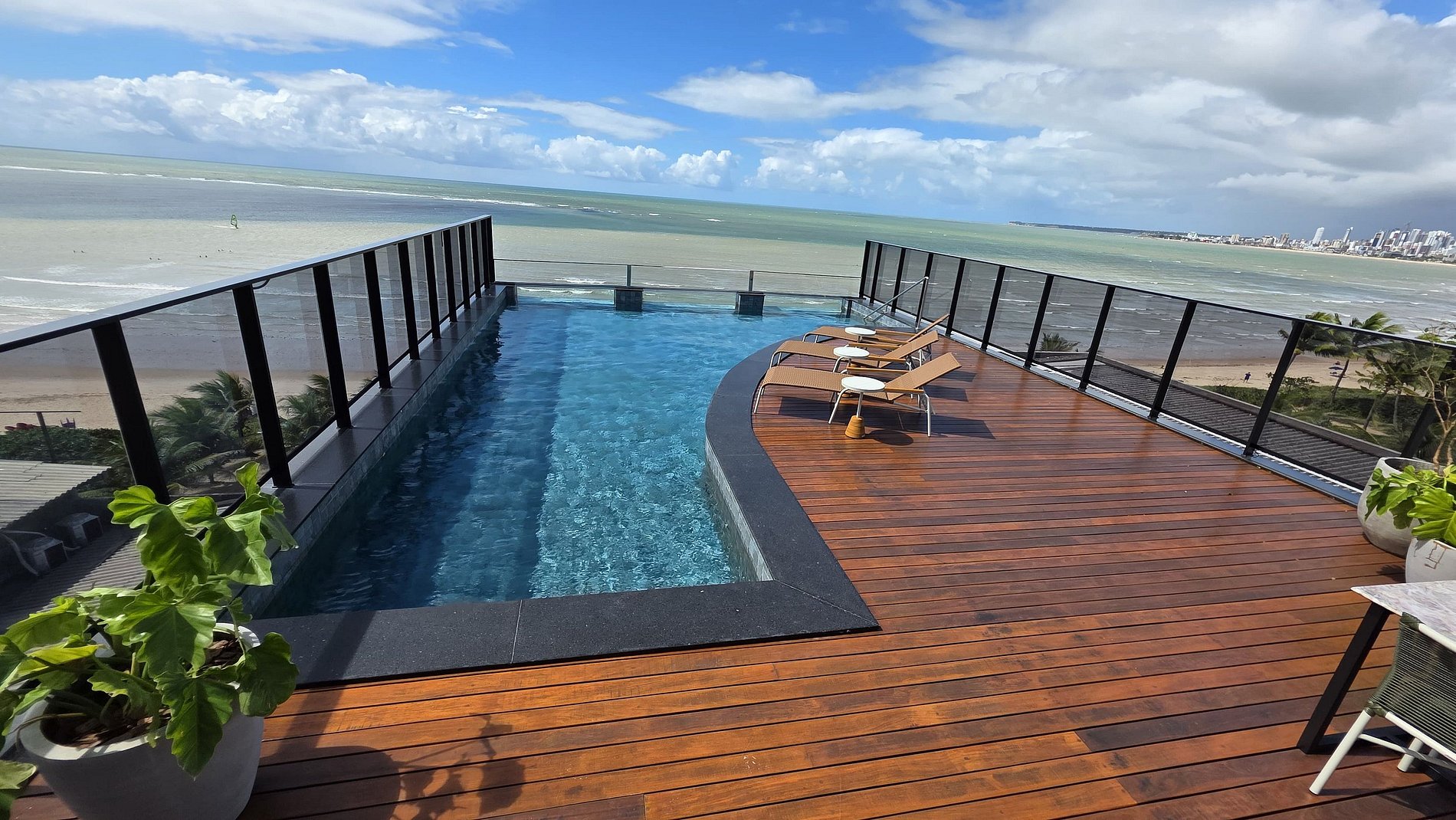 Piscina de borda infinita na cobertura, com vista panorâmica do litoral;
