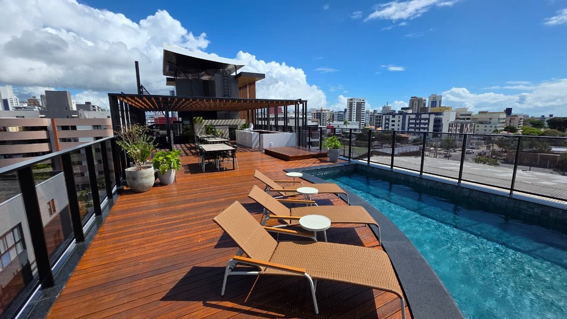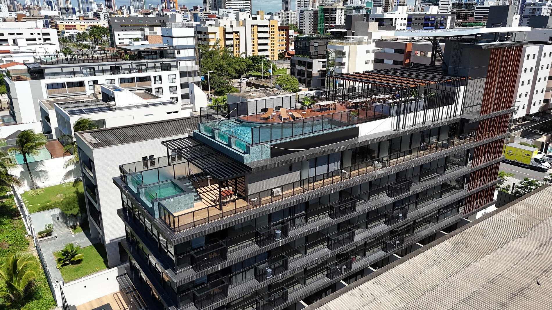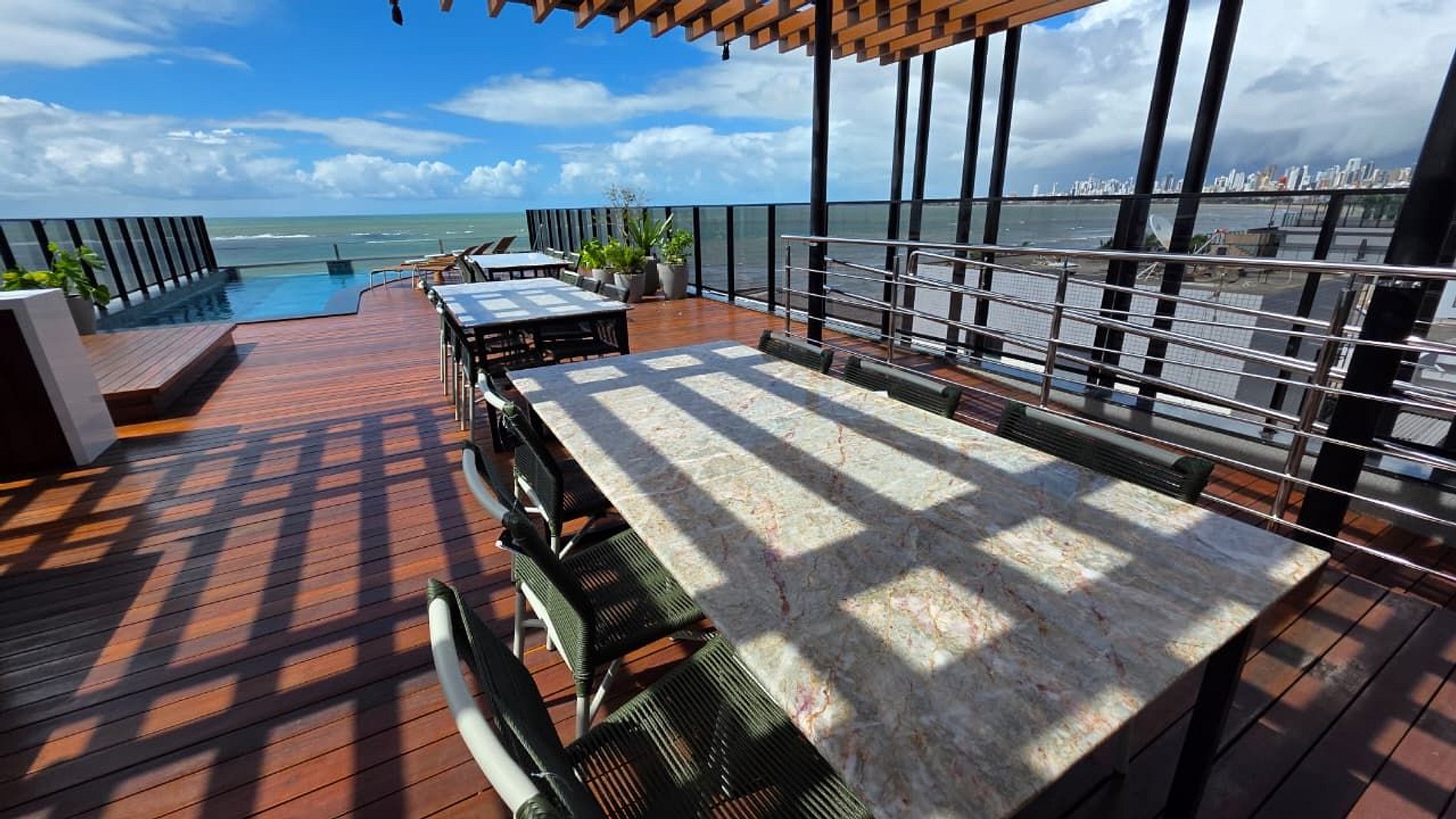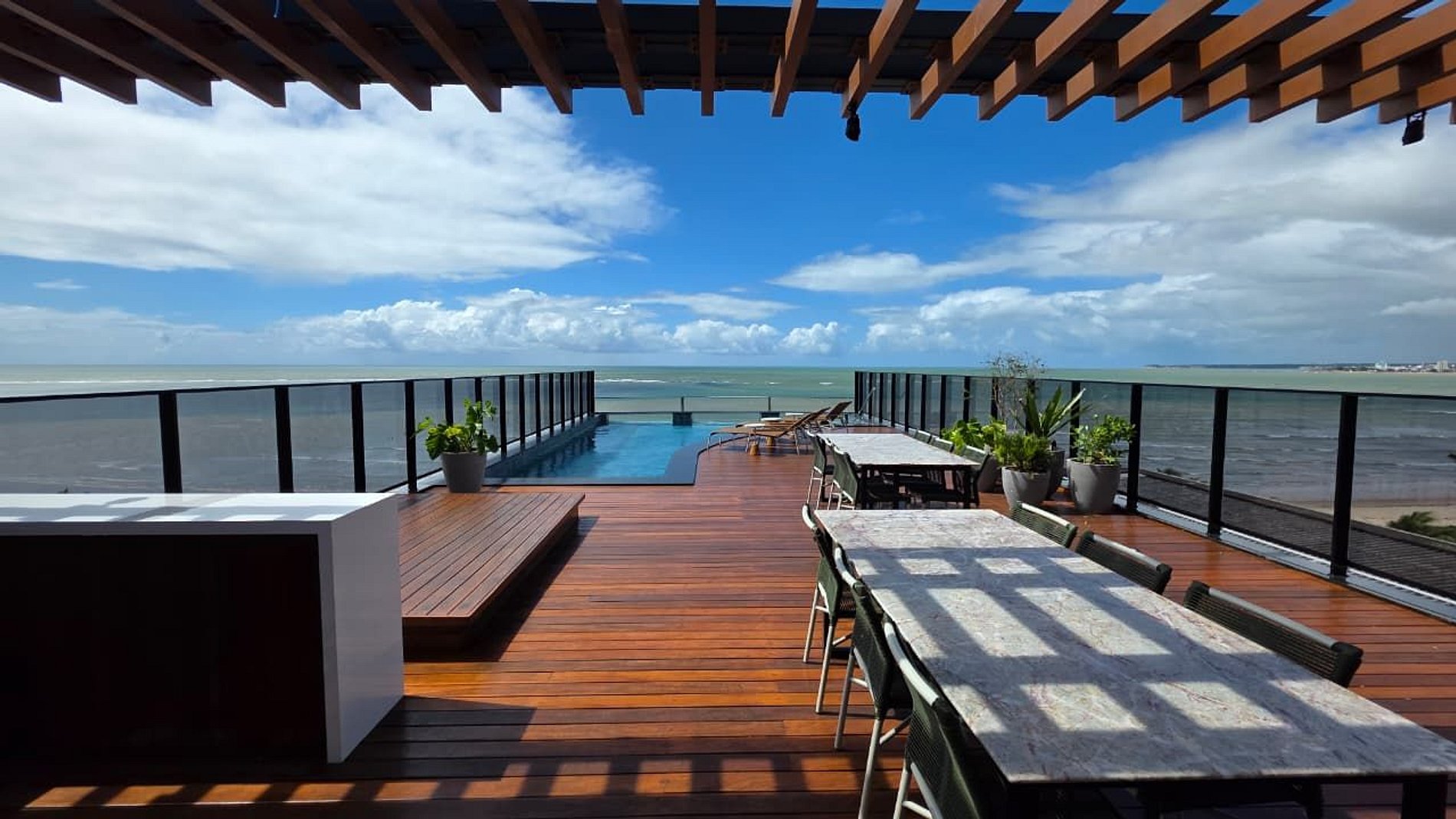 Piscina de borda infinita na cobertura, com vista panorâmica do litoral;