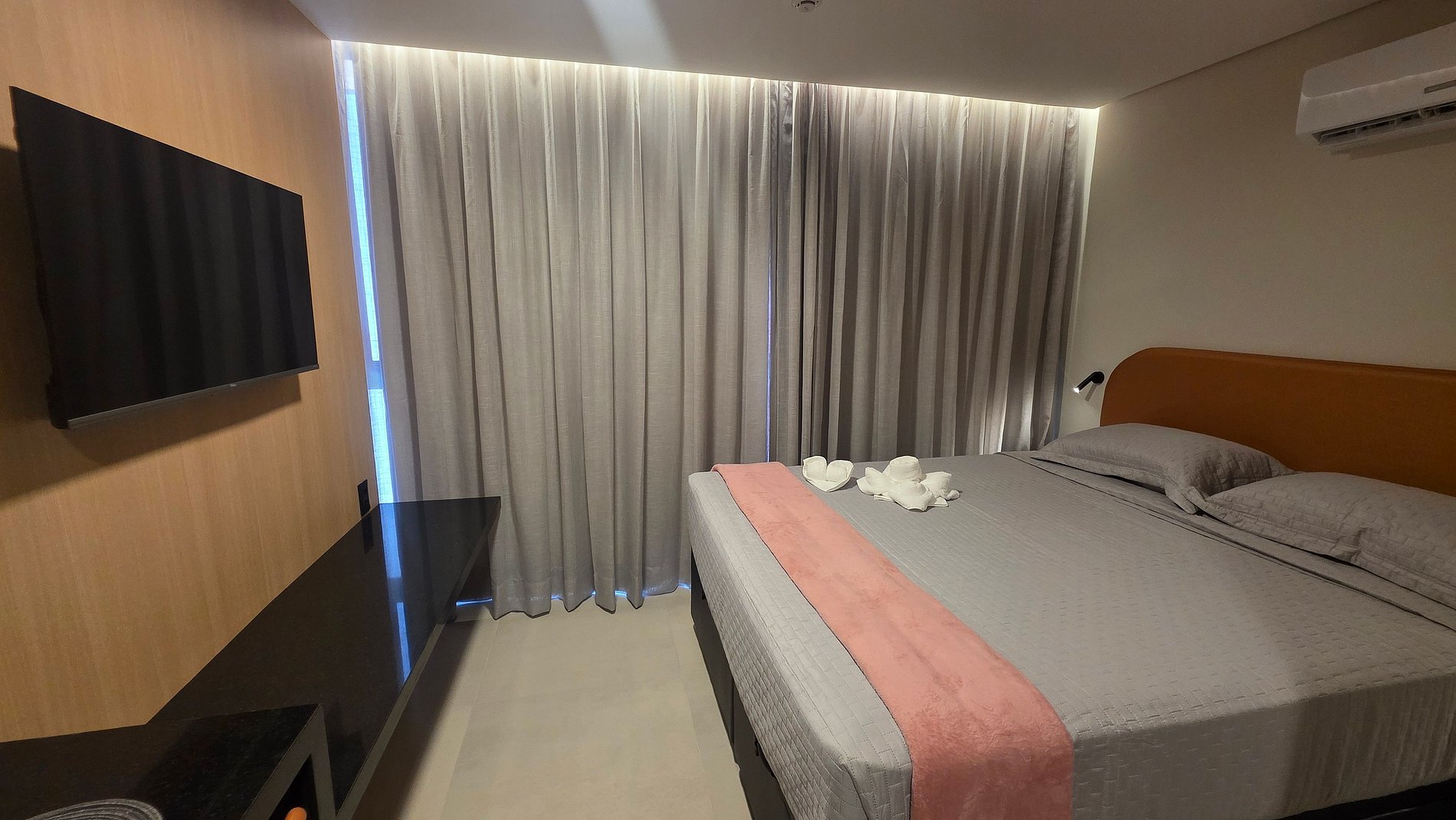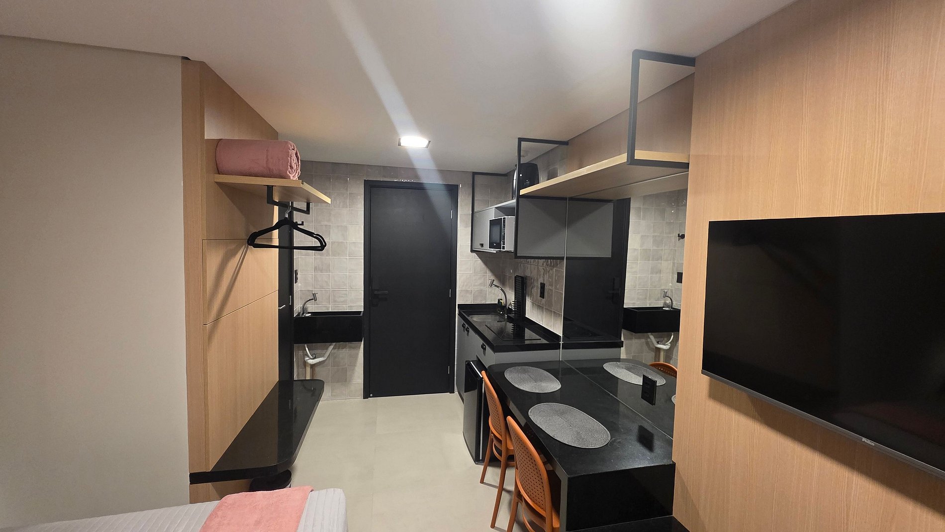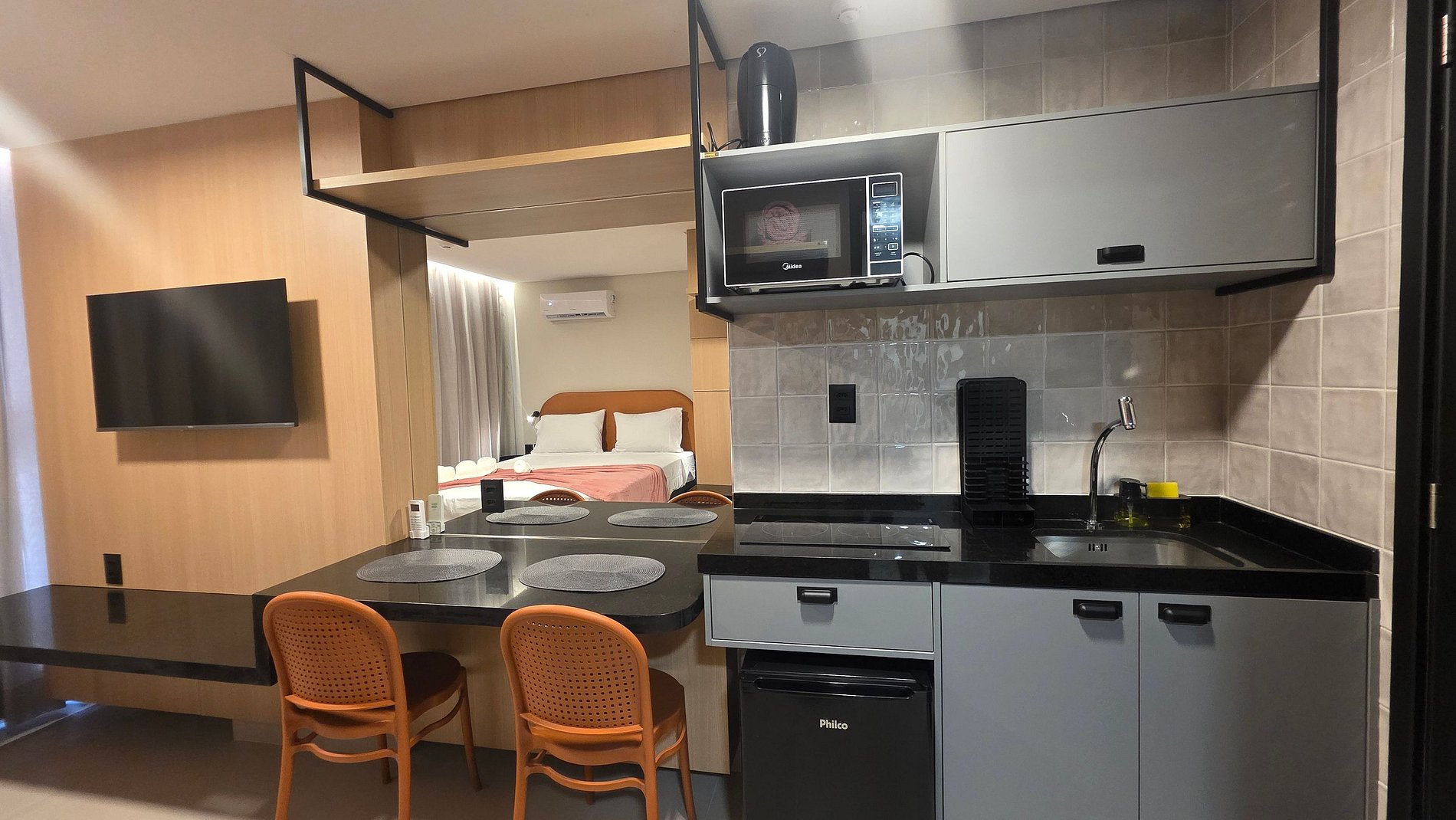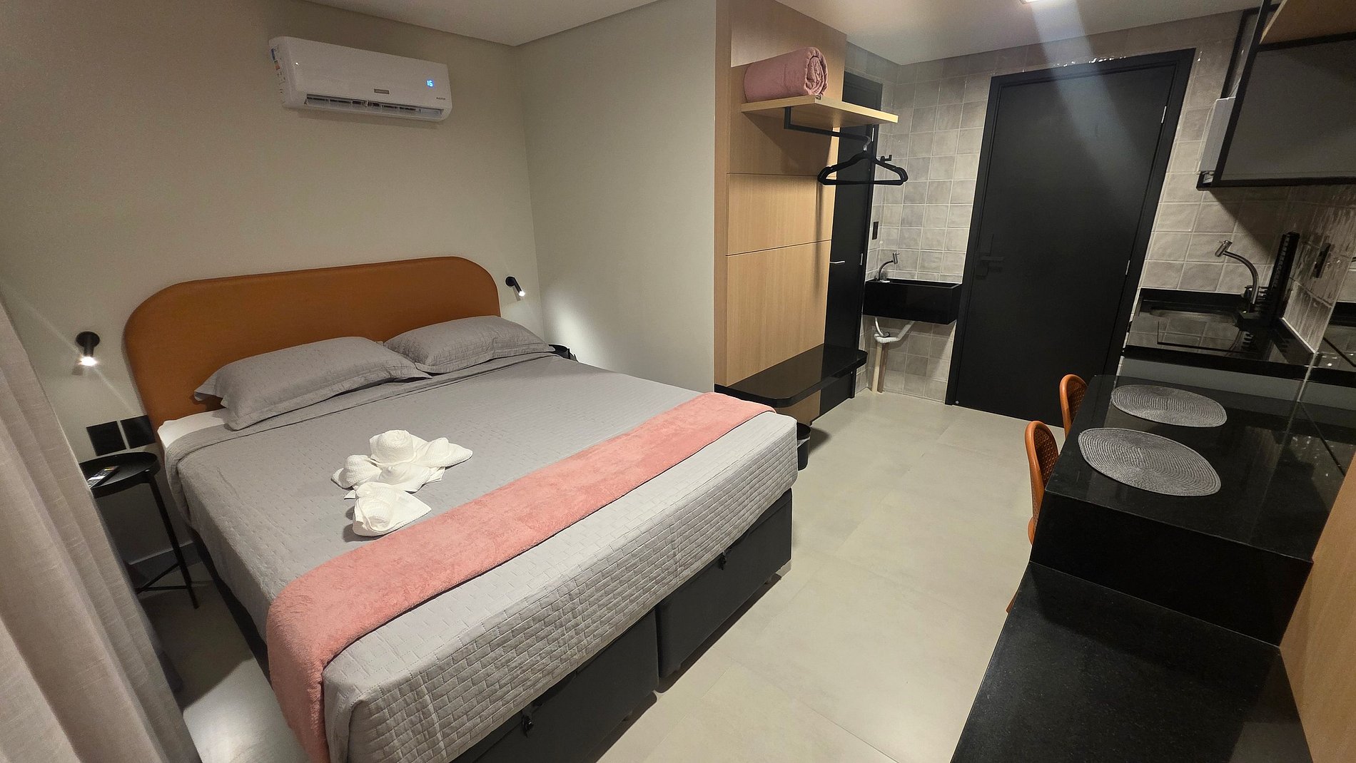Nosso flat foi projetado para unir conforto e funcionalidade. O ambiente é climatizado, possui cama de casal aconchegante, TV, mesa de trabalho e uma cozinha compacta equipada para pequenas refeições. A iluminação moderna e a decoração clean criam um espaço agradável para relaxar ou trabalhar.