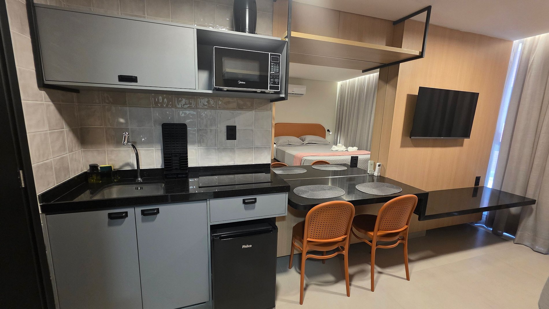 - Cozinha equipada com frigobar, micro-ondas e utensílios básicos para refeições rápidas.