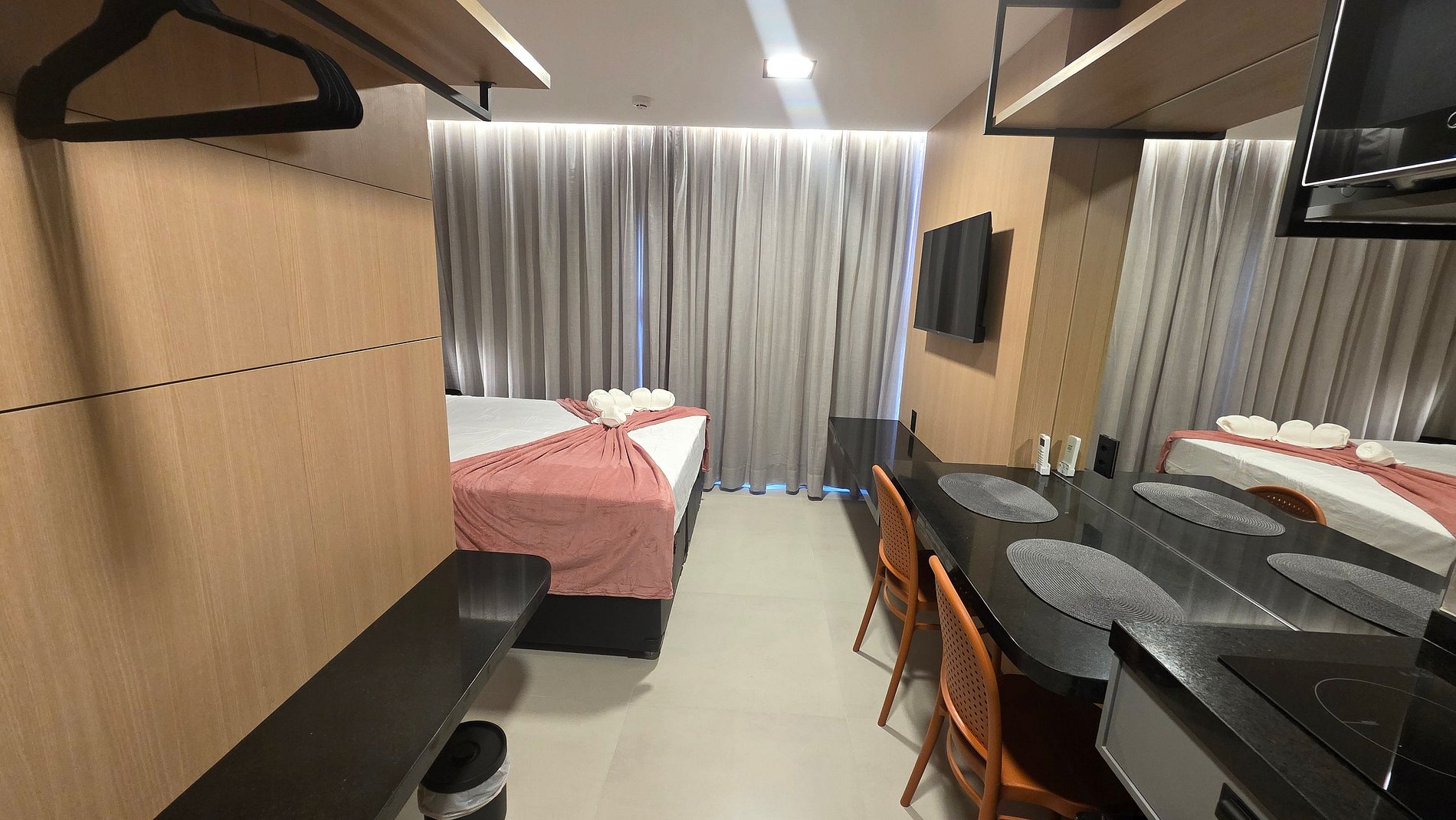 Nosso flat foi projetado para unir conforto e funcionalidade. O ambiente é climatizado, possui cama de casal aconchegante, TV, mesa de trabalho e uma cozinha compacta equipada para pequenas refeições. A iluminação moderna e a decoração clean criam um espaço agradável para relaxar ou trabalhar.