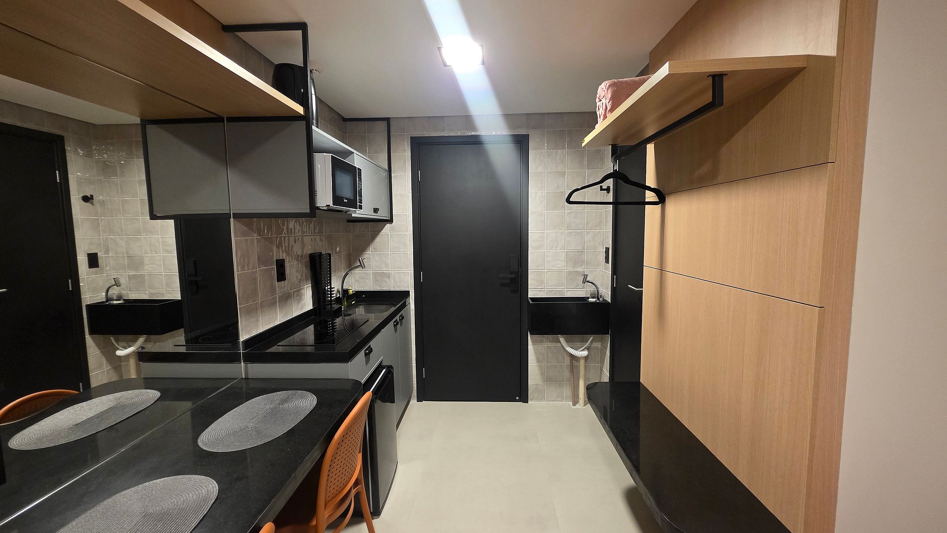 - Cozinha equipada com frigobar, micro-ondas e utensílios básicos para refeições rápidas.