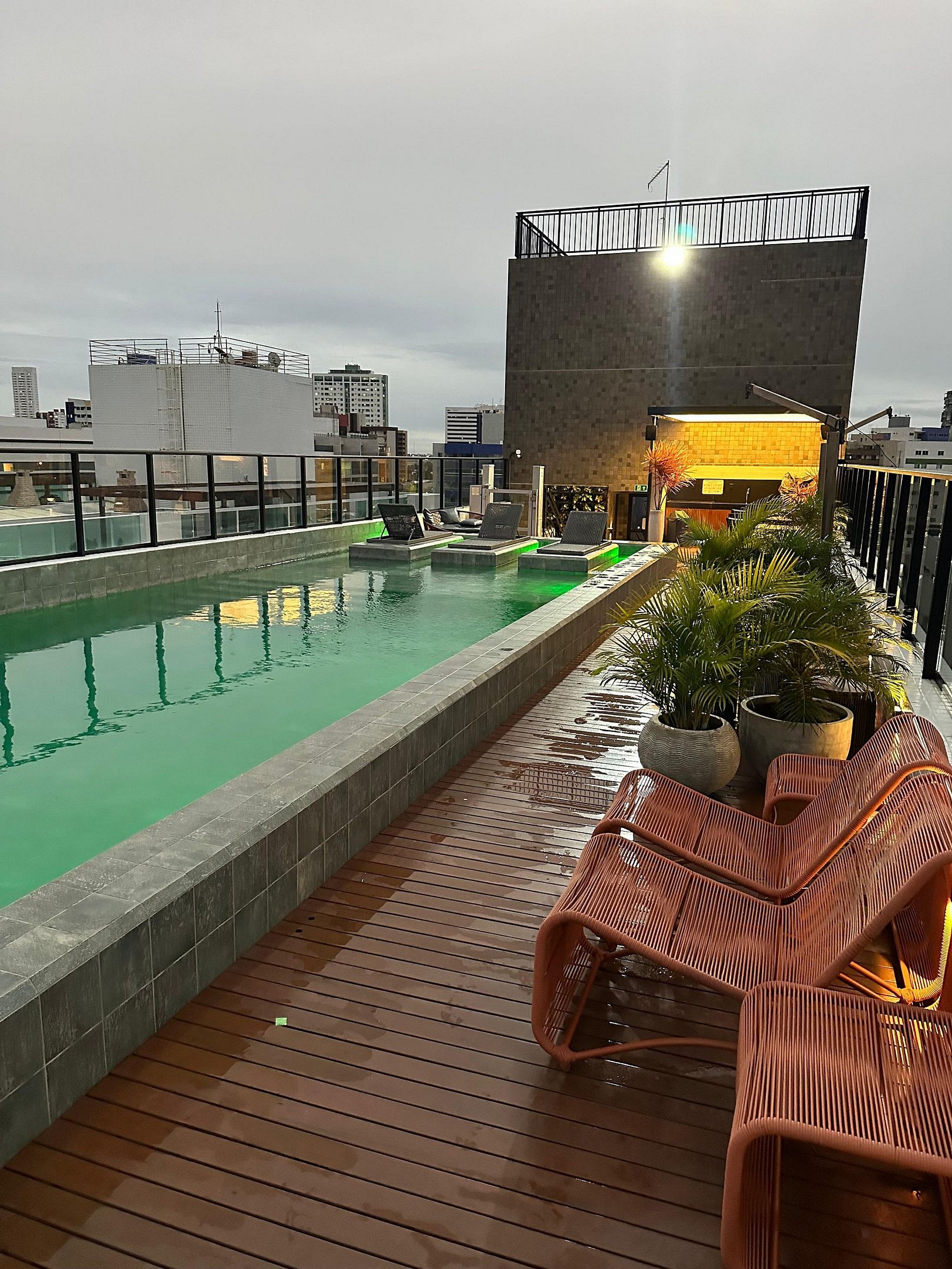 Aqui, você aproveita uma piscina na cobertura com vista panorâmica para o mar, perfeita para momentos de relaxamento e contemplação do pôr do sol.