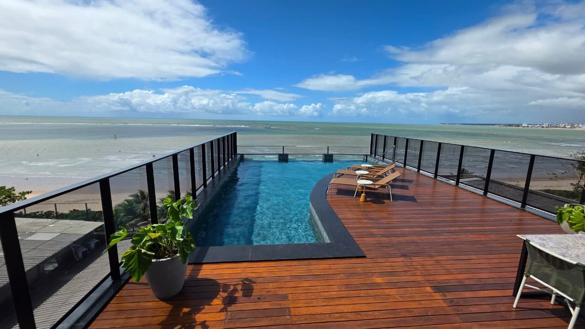 Piscina de borda infinita na cobertura, com vista panorâmica do litoral;