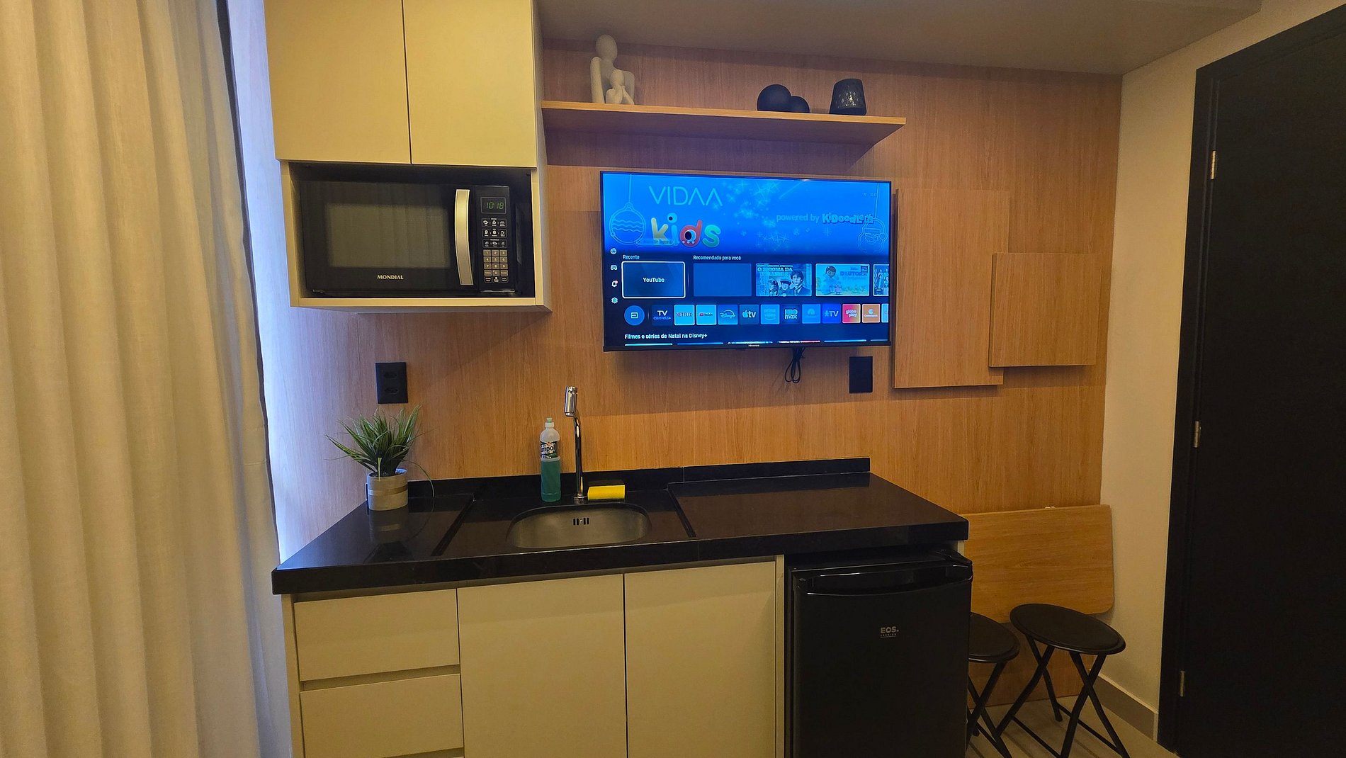 - Cozinha equipada com frigobar, micro-ondas, cafeteira e utensílios básicos para refeições rápidas.